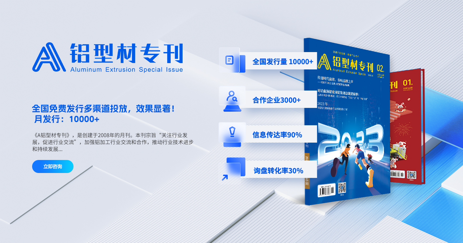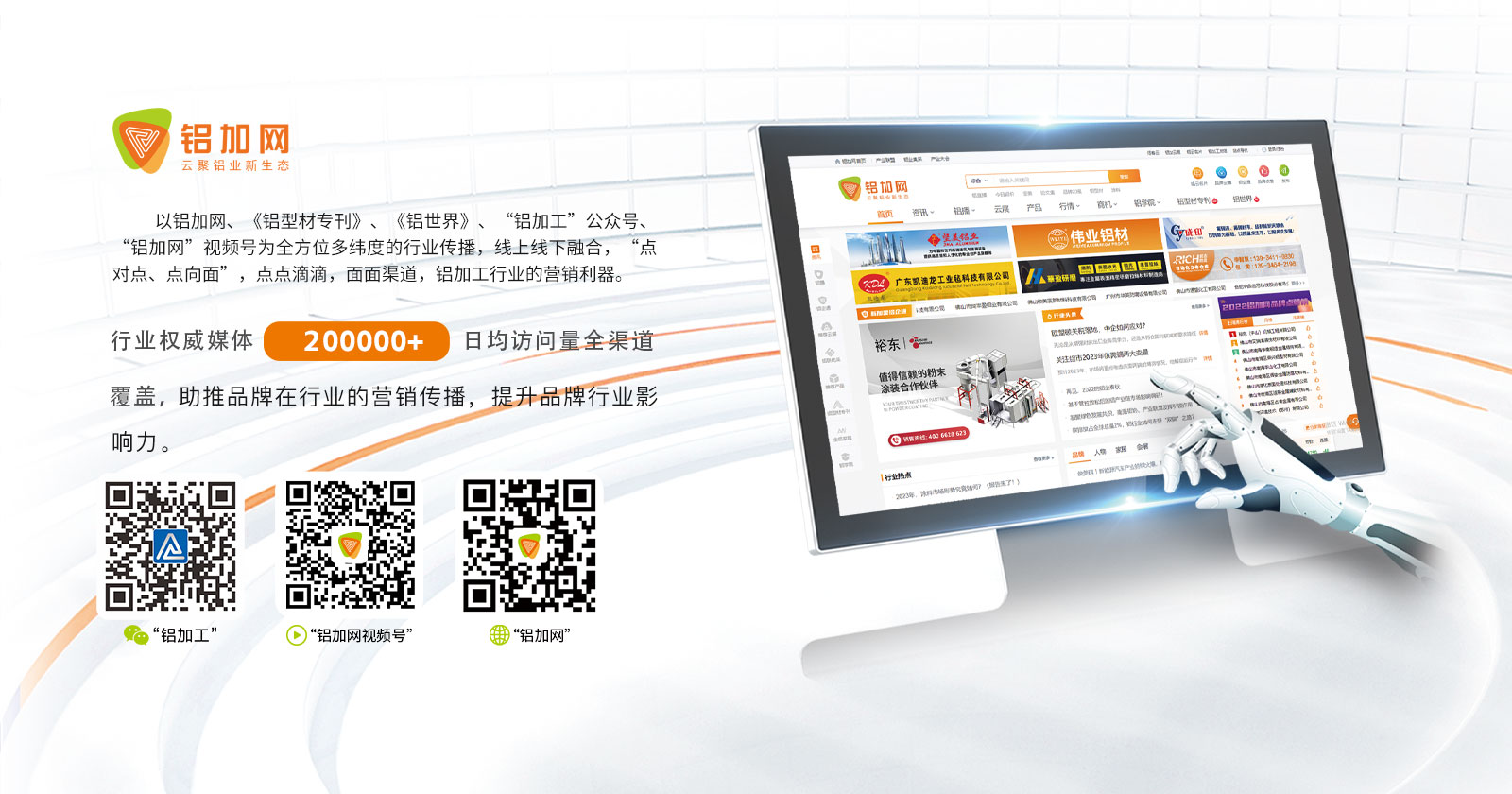 鋁加網(wǎng)(www.albiz.cn)是聞名鋁加工行業(yè)的垂直門戶網(wǎng)站,云聚鋁業(yè)新生態(tài),構(gòu)建鋁業(yè)新場(chǎng)景,以albiz.cn 網(wǎng)站為核心,以移動(dòng)云端、鋁加工微信、鋁加網(wǎng)視頻號(hào)、《鋁型材專刊》和《鋁世界》雜志為載體,成為了鋁加工行業(yè)資訊和精準(zhǔn)傳播的首選傳媒。鋁加網(wǎng),采集和發(fā)布全行業(yè)信息資訊,提供線上展覽、在線直播、短視頻、品牌策劃、品牌運(yùn)營(yíng)、品牌傳播等全方位的專業(yè)服務(wù)。